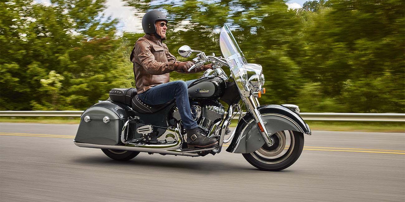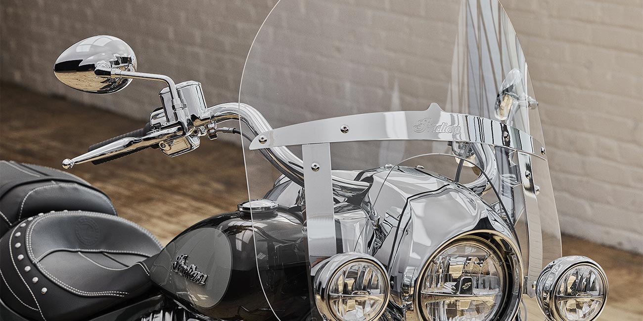 | Standard Equipment | Quick Release Windshield; Genuine Leather Seat; Remote-Locking Hard Saddlebags, Highway Bars; Tyre Pressure Monitoring; Light Bar; Selectable Ride Modes, ABS; Cruise Control; Keyless Ignition; Indian® Script Tank Badge; 12v Charging Port |